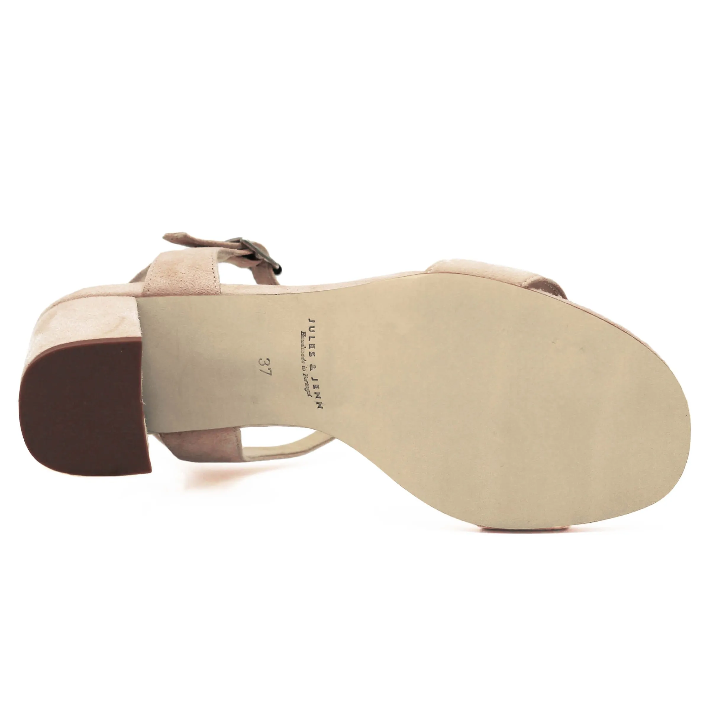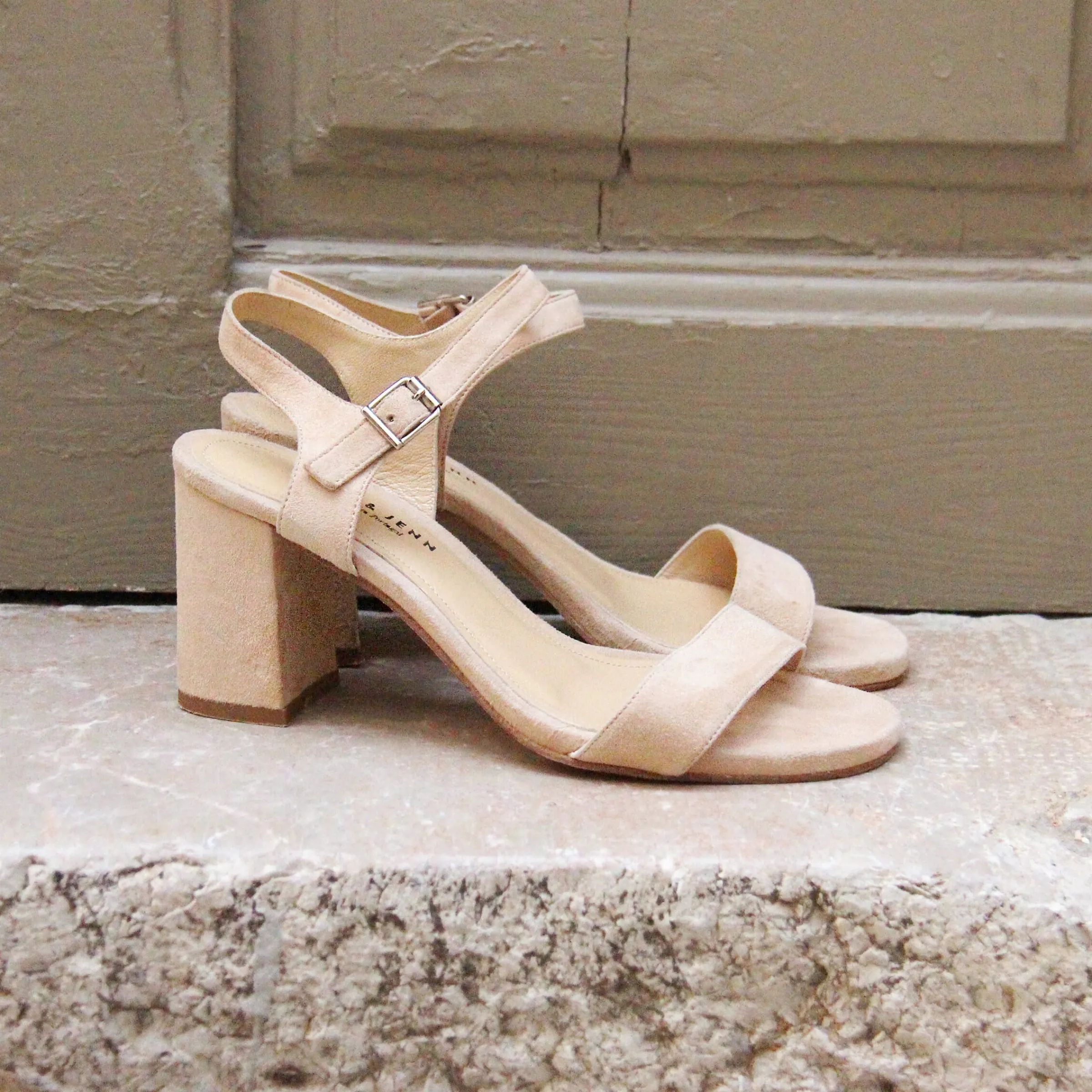 - Sandale à talon en cuir velours, ou daim, beige